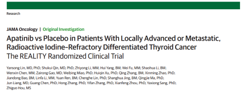 2021年12月16日,权威医学杂志《JAMA Oncology》(影响因子31.777)在线发表阿帕替尼的一项III期临床研究(REALITY)——甲磺酸阿帕替尼片治疗局部进展/转移性放射性碘难治性分化型甲状腺癌(RAIR-DTC)患者的多中心、随机、双盲、安慰剂对照临床研究。此研究由北京协和医院的林岩松教授和南京金陵医院的秦叔逵教授发起,在全国21个研究中心展开,由AG亚游集团医药中央医学事务部团队支持完成。