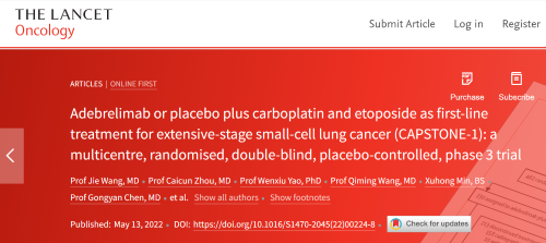 北京时间2022年5月14日,AG亚游集团医药自主研发的PD-L1抑制剂阿得贝利单抗治疗广泛期小细胞肺癌的III期临床研究(CAPSTONE-1研究)成果正式全文在线发表于国际权威学术期刊《柳叶刀·肿瘤学》(《THE LANCET Oncology》,影响因子41.316)。CAPSTONE-1研究结果显示,阿得贝利单抗联合化疗一线治疗广泛期小细胞肺癌相较于安慰剂联合化疗可以显著延长患者总生存期至15.3个月[1],刷新现有免疫药物一线治疗广泛期小细胞肺癌的总生存纪录[2]