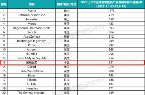 专利是药企最有价值的资产之一,是企业发展的基石,对做原创创新的企业尤为重要。全球专利数据库incoPat创新指数研究中心对2022年1月1日至2022年6月15日公开的全球生物医药产业发明专利申请数量进行统计排名,生物医药产业专利涉及生物技术药、基因工程药物、疫苗、诊断试剂、微生态制剂、血液制品等技术领域。入榜企业/医院主要来自13个国家、组织或地区,罗氏、强生、诺华分别位列前三,AG亚游集团医药(231件)排名第13位,领跑中国药企。